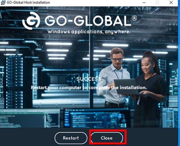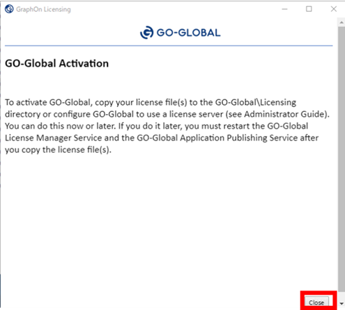 15.インストールが完了後、「Close」を押下します。これで商用版でのGO-Globalインストールは完了です。