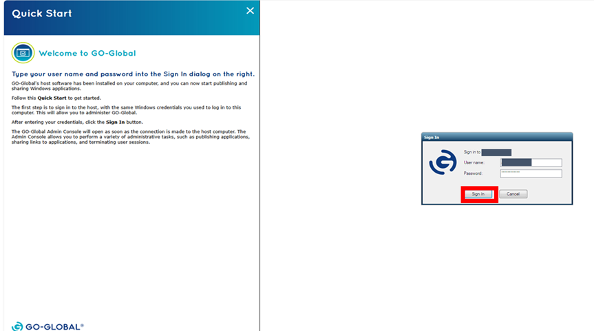 ※ Go-Globalへのサインインは、Go-Globalをインストールする対象のサーバの認証情報を利用します。前段の手順にてGo-Globalのインストール作業を行ったユーザでサインインできます。