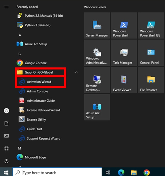 3.ライセンスの設定を実施するため、スタートメニューから GraphOn GO-Global > ActiveWizard を押下します。