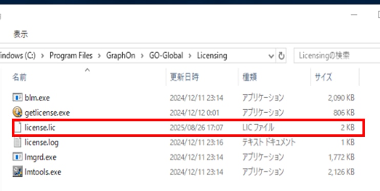 8.「PC>ローカルディスク(C:)>Program Files>GraphOn>GO-Global>Licensing」を開き、 GO-Globalインストールの手順12で作業用フォルダに配置した「license.lic」ファイルを格納します。