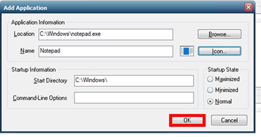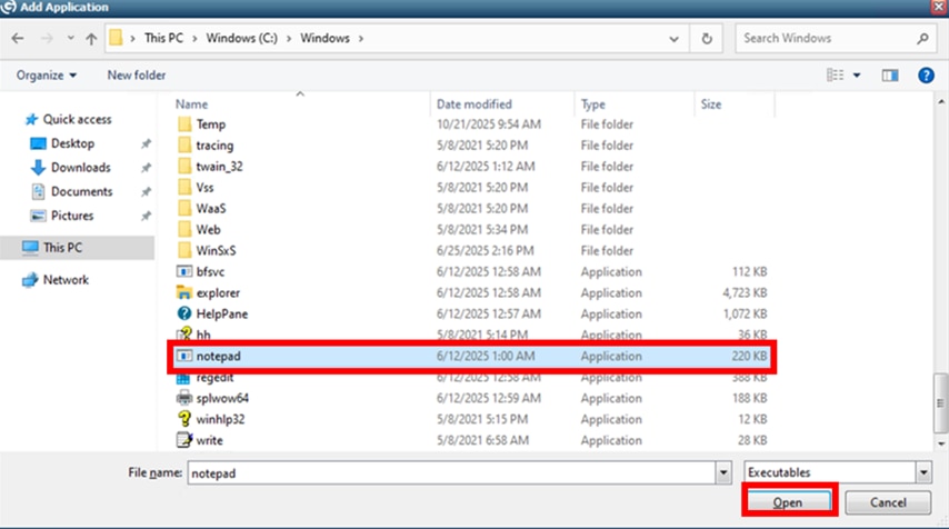 2.「Browse」を押下し、「This PC>Windows(C:)Windows>notepad」を選択し、「Open」を押下します。