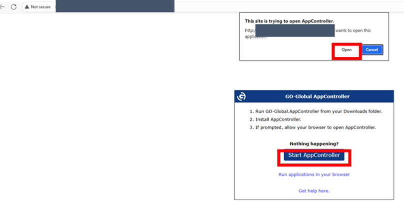 5.手順2にてコピーしたURLをもう一度入力し、「Start AppContoller」を選択後「Open」を押下します。