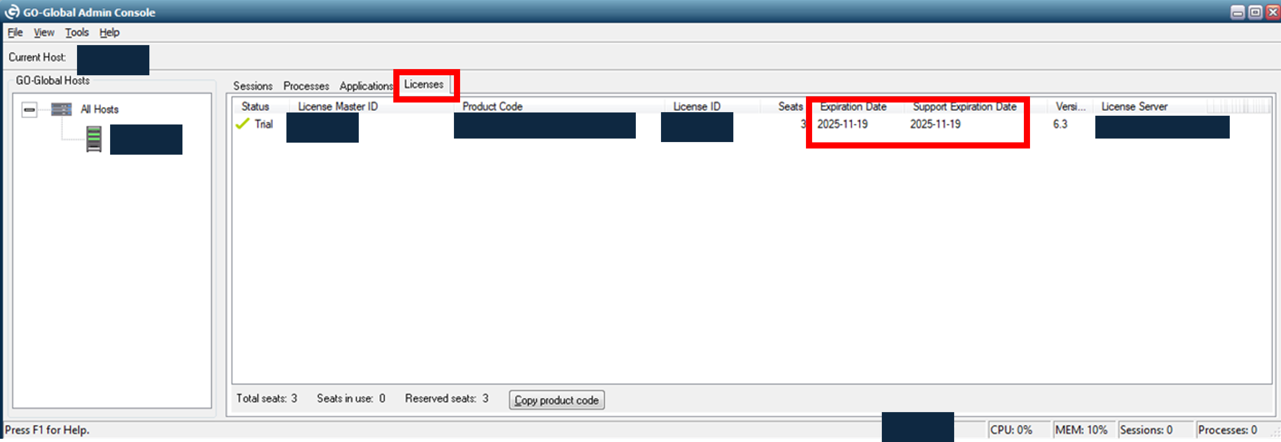 「GO-Global Admin Console」>「Licenses」からライセンスの期間を確認することができます。
