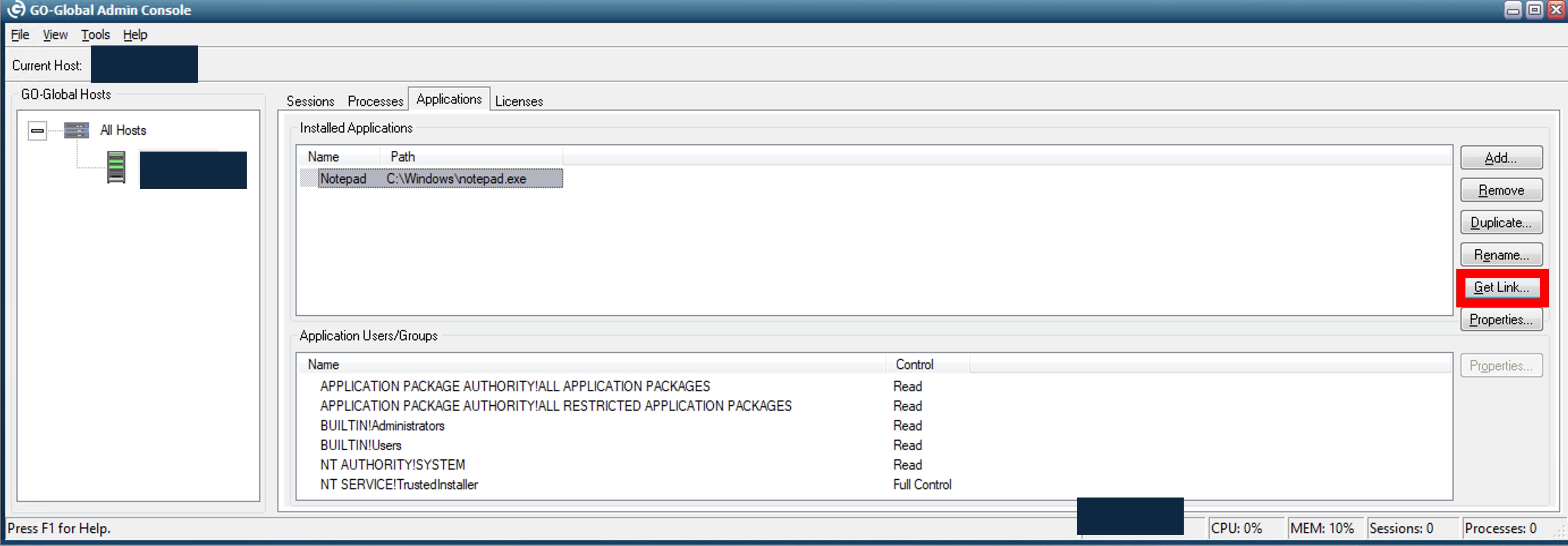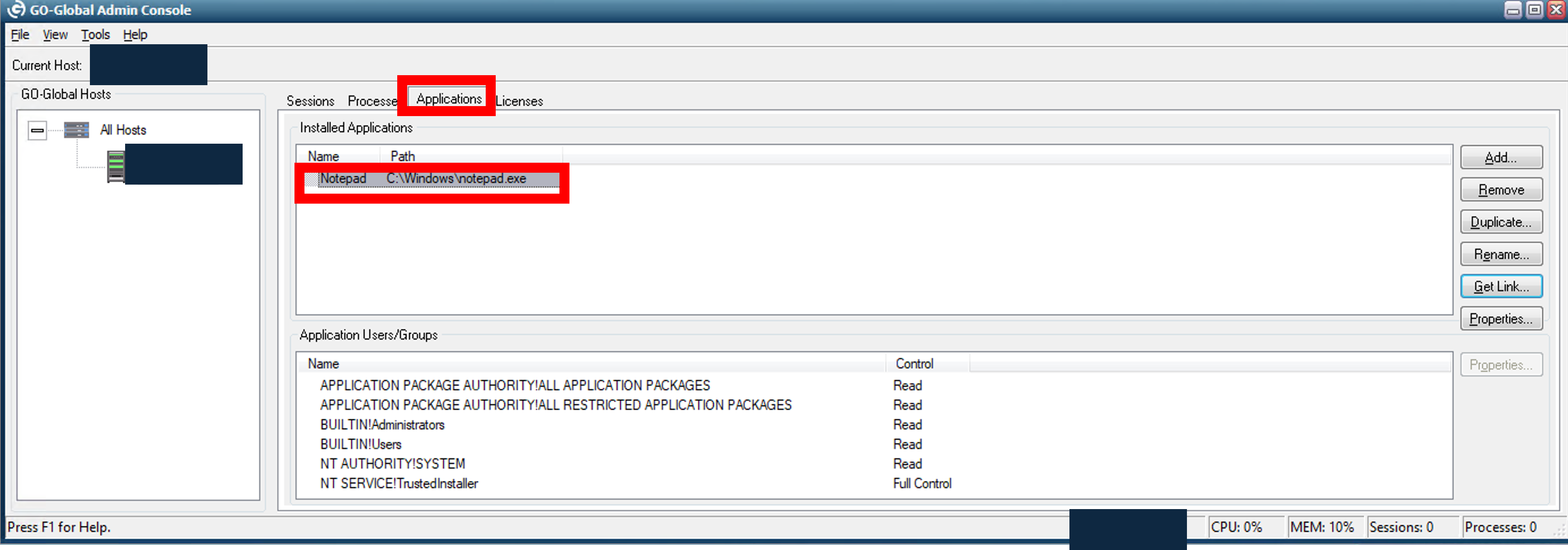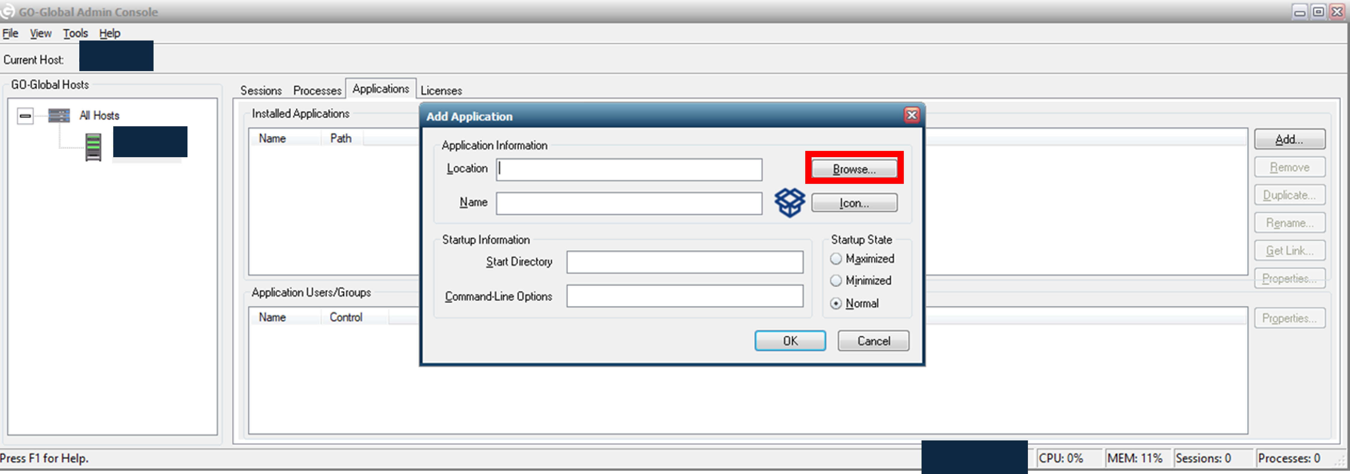 1.「GO-Global Admin Console」>「Applications」>「Add」の順番に押下します。
