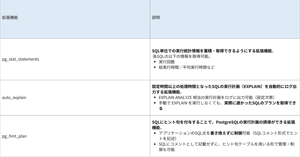 · 拡張機能:以下の性能解析やチューニング時によく用いられる拡張機能を使用