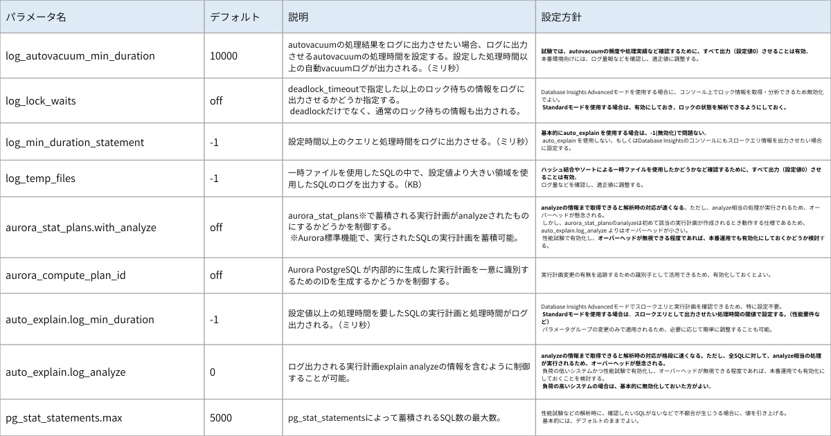 従来のPostgreSQL から共通する知識とともにAurora の機能特性を理解した上で、要件上必要かどうかを判断し、設定値を検討することが必要となります。