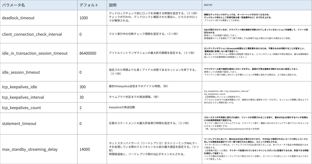 また、default_statistics_target や autovacuum の analyze 系パラメータは、統計情報の精度を見きわめながら設定します。