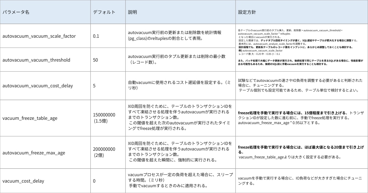 特に大規模・高更新テーブルでは、デフォルト設定のままでは autovacuum が追いつかず、性能劣化につながる場合もあります。
