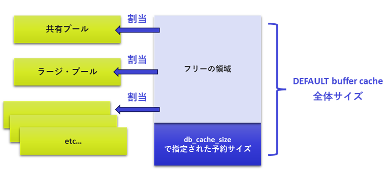 共有プールの割り当ては、DEFAULT buffer cacheから割り当てられるため、この値が枯渇していないことを確認します。DEFAULT buffer cacheは初期化パラメータdb_cache_sizeで指定したサイズは予約されており、割り当てができないサイズであることに注意してください。